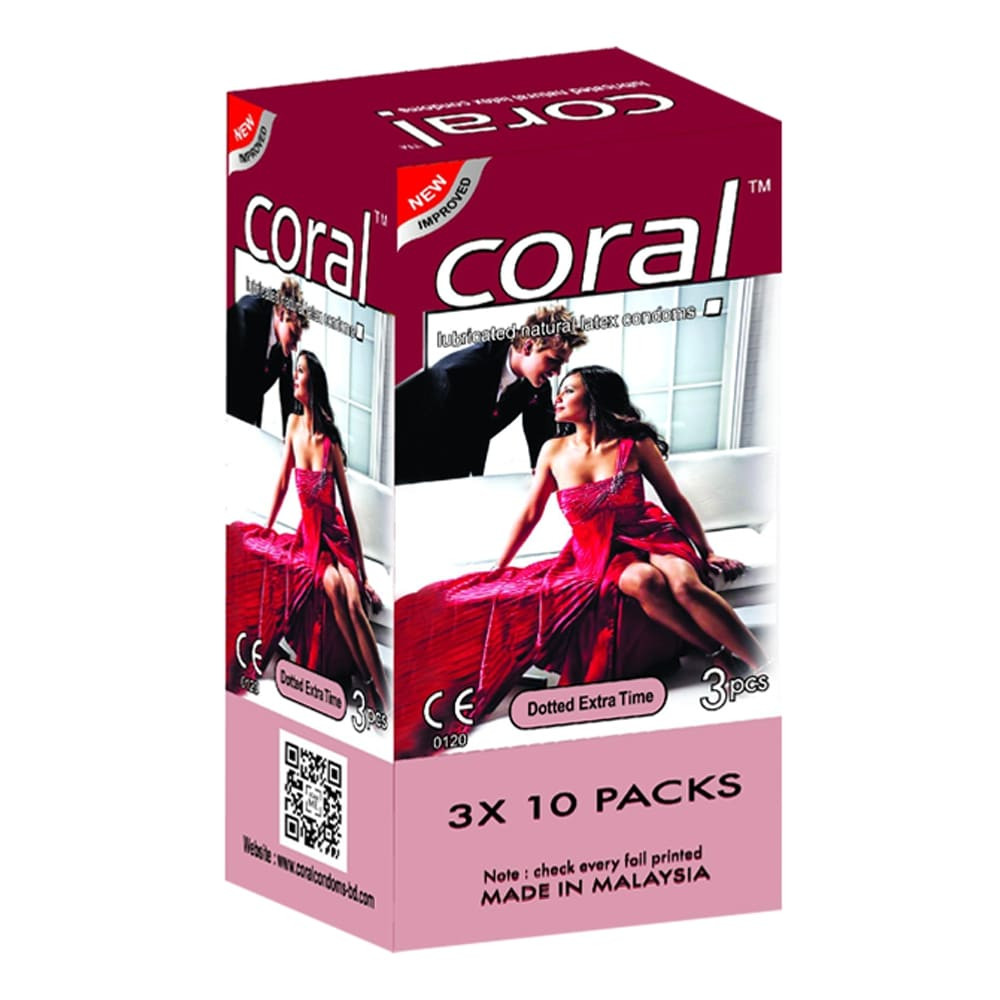 "Experience heightened pleasure and extended intimacy with Coral Dotted Extra Time Condoms. Featuring a dotted texture and a special lubricant to prolong sensation, these condoms offer an exhilarating experience for you and your partner. Crafted with premium natural latex for reliable protection, Coral Dotted Extra Time condoms combine pleasure with peace of mind. Explore the tantalizing texture and enjoy prolonged pleasure with Coral Dotted Extra Time Condoms. Elevate your intimate moments and make every encounter unforgettable."