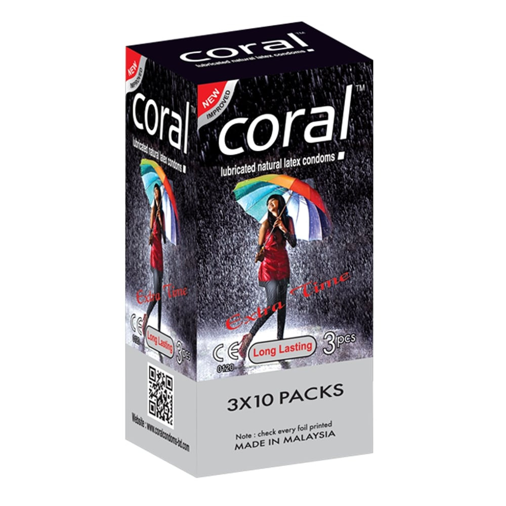 "Extend your pleasure with Coral Lasting Extra Time Lubricated Natural Latex Condoms. Designed to enhance stamina and prolong intimacy, these condoms feature a special lubricant to help delay ejaculation and extend your enjoyment. Crafted with premium natural latex for reliable protection, Coral Lasting Extra Time condoms offer both confidence and comfort. Explore the sensation of lasting longer and intensify your connection with your partner. Elevate your pleasure and savor every moment with Coral Lasting Extra Time Lubricated Natural Latex Condoms."