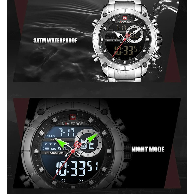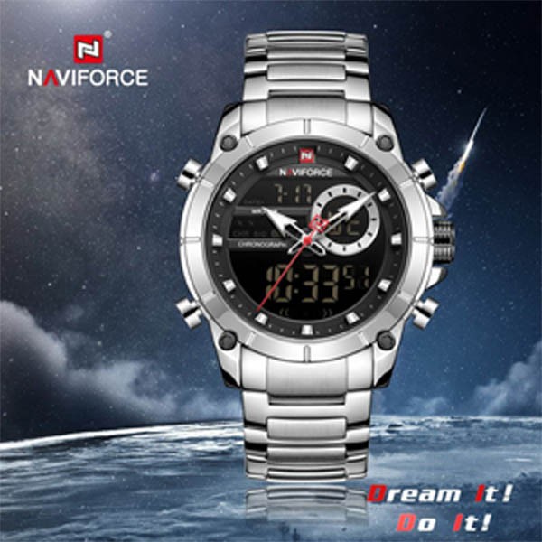 NAVIFORCE 9163 Silver Black Dial Stainless Steel Dual Time Men's Watch