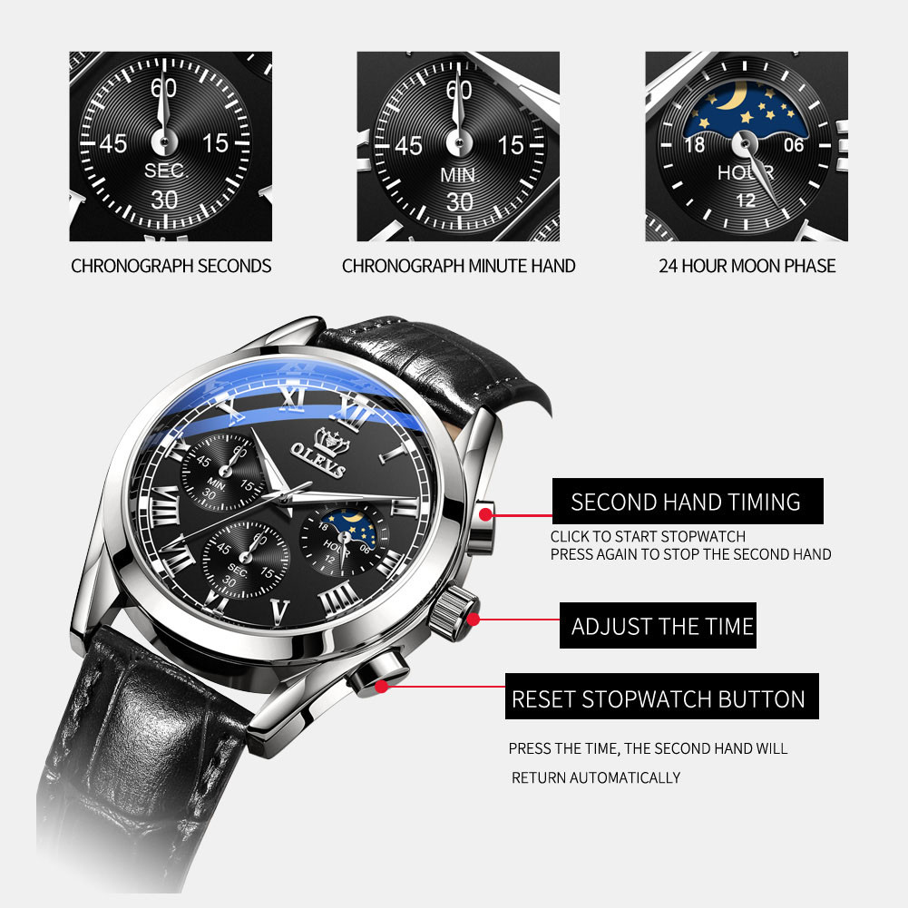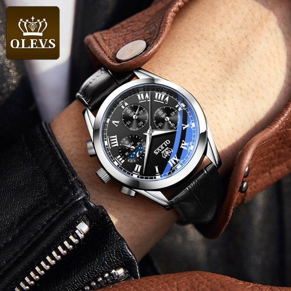 OLEVS 2871 Waterproof Genuine Leather Belt Watch for Men's-Silver Black