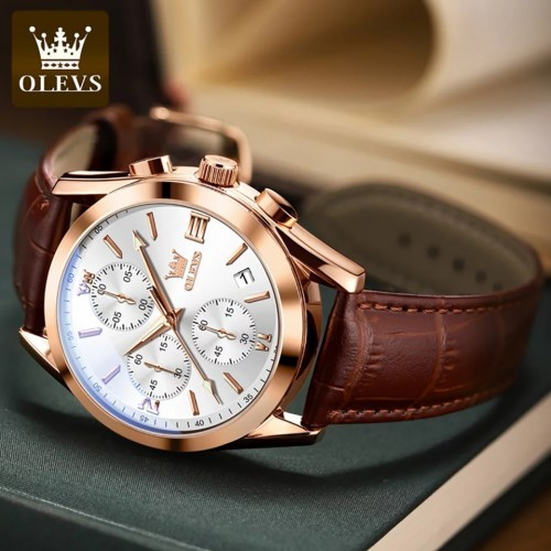 OLEVS 2872 Waterproof Genuine Leather Belt Quartz Wrist watch for Men's-Rose White