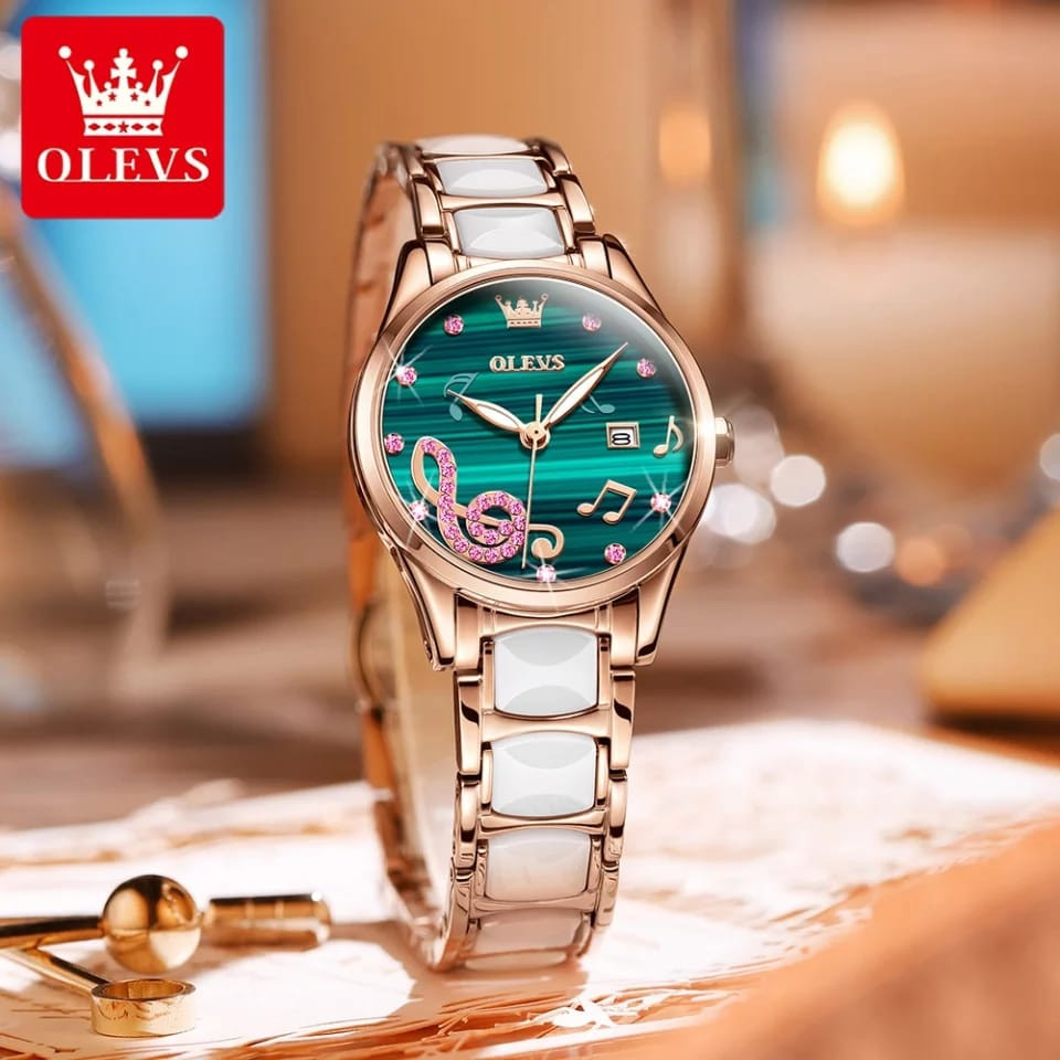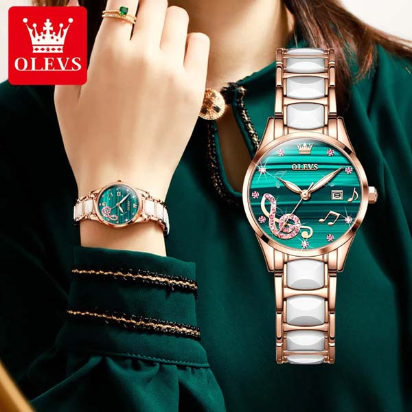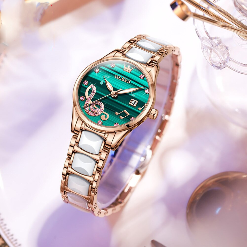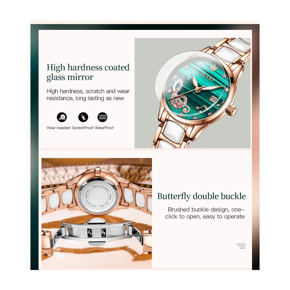 OLEVS 3605 Luxury Women's Fashion Simple Temperament Stainless Steel Ceramic Strap Quartz Watch Rose Gold White & Green