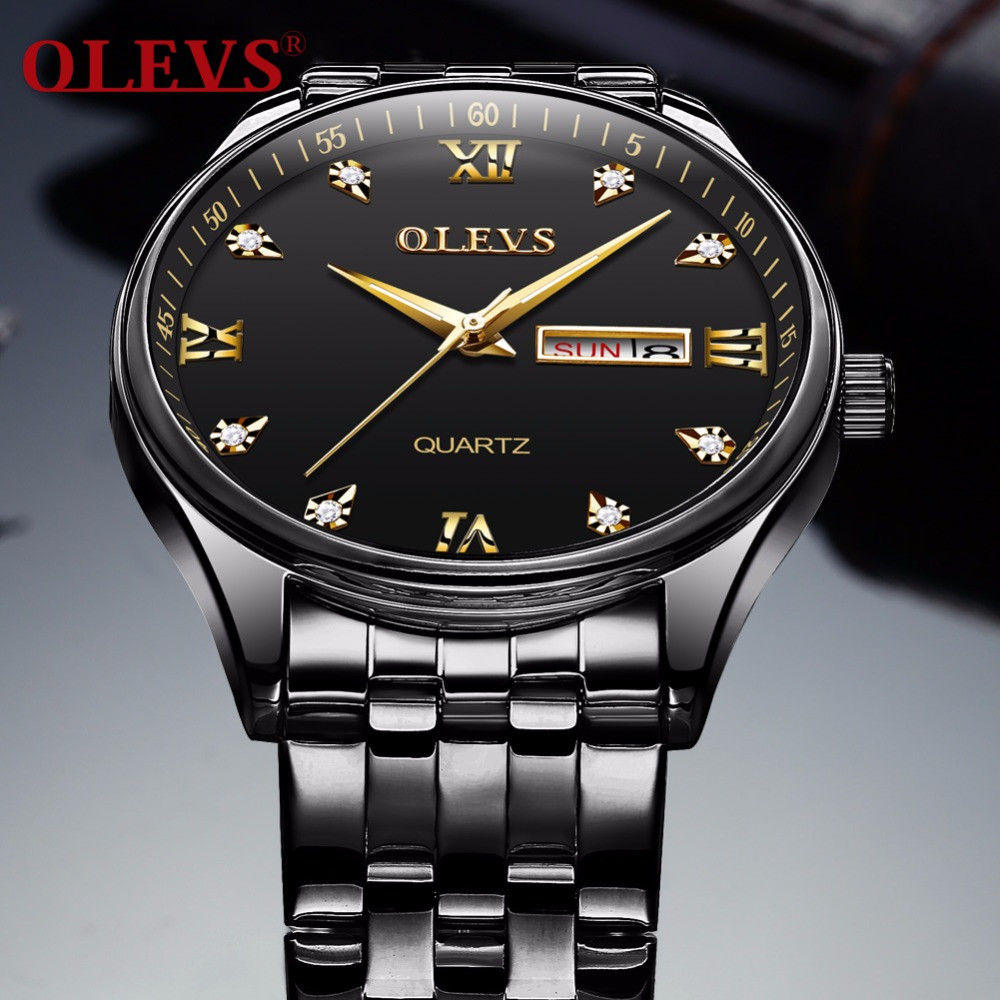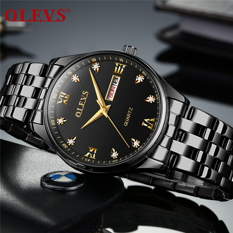 OLEVS 5570 Men's Stainless Steel Luminous Dial Date and Week Waterproof Quartz Wrist Watch- Black