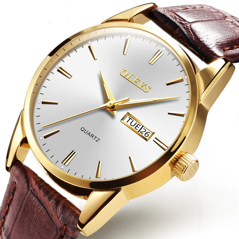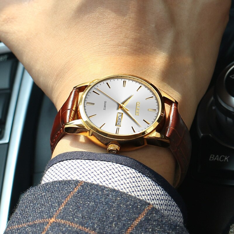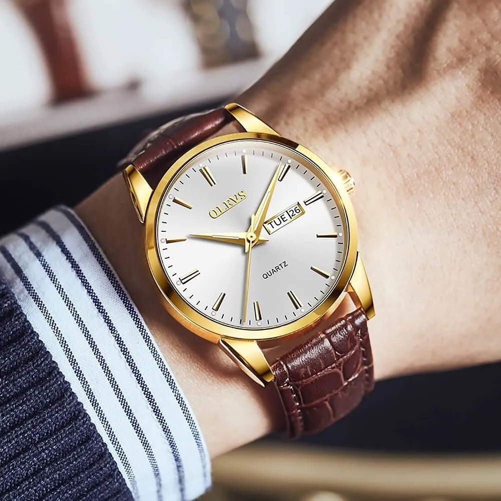 OLEVS 6898 Silver Dial Genuine Leather Quartz Watch for Man's