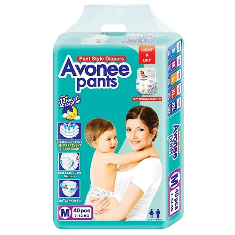 "Ensure your little one's comfort and protection with Avonee Baby Pant Style Diapers in Medium size. Designed for a snug fit and reliable absorbency, these diapers offer peace of mind for parents and freedom of movement for babies. Featuring a convenient pant-style design for easy changing and soft, breathable materials, Avonee Baby Diapers provide gentle care for delicate skin. Keep your baby happy and dry throughout the day with Avonee Baby Pant Style Diapers in Medium size."