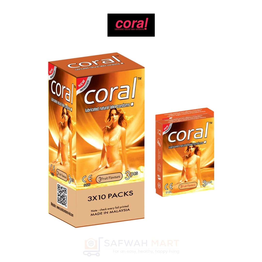 "Experience a burst of tropical delight with Coral 3 Fruits Flavors Lubricated Natural Latex Condoms. Infused with the exotic essence of three tantalizing fruits, these condoms offer a deliciously sensual encounter for you and your partner. Crafted with premium natural latex and lubricated for smoothness, Coral 3 Fruits condoms provide reliable protection while enhancing intimacy. Explore the exhilarating blend of flavors and indulge in a heightened sensory experience. Elevate your pleasure with Coral 3 Fruits Flavors Lubricated Natural Latex Condoms."