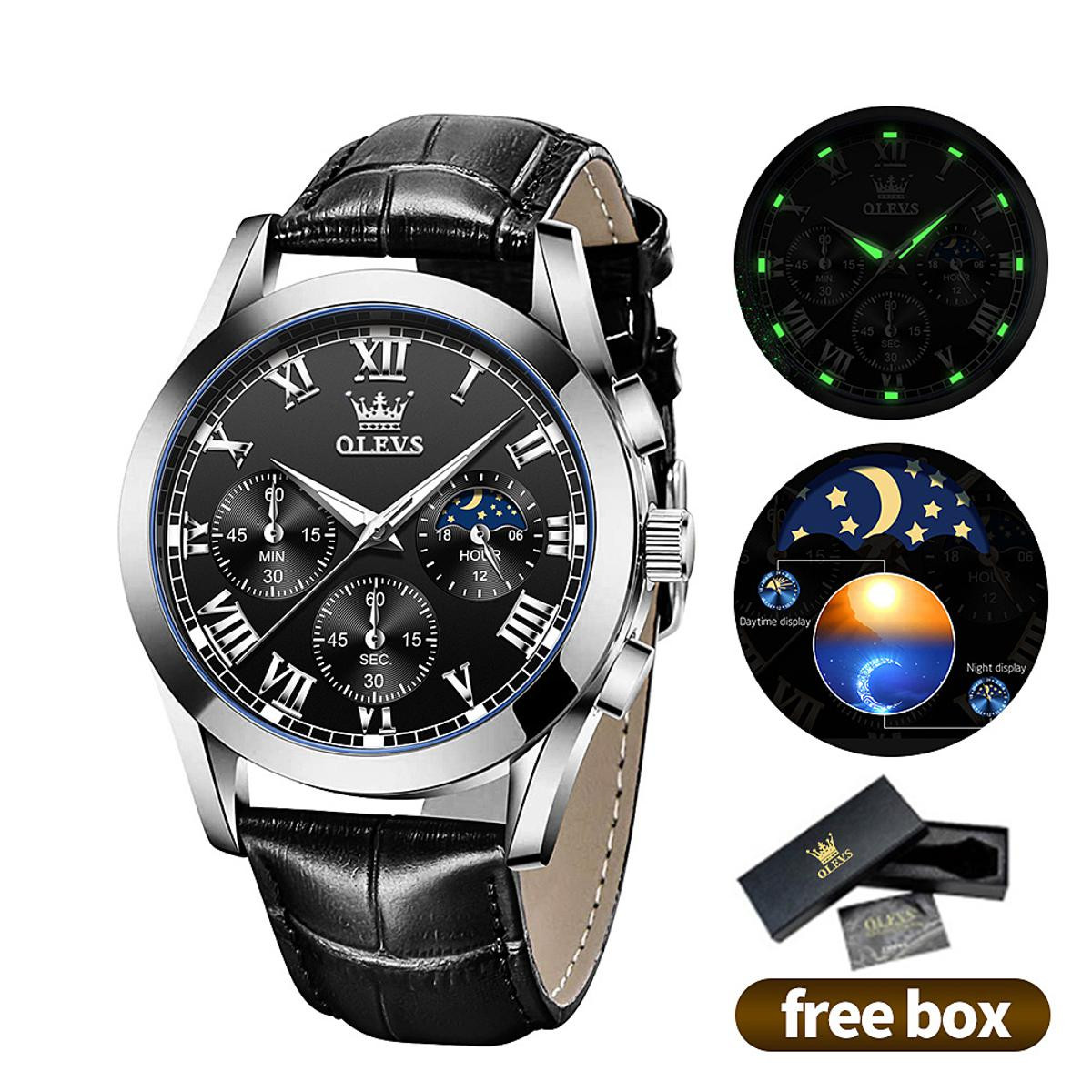 OLEVS 2871 Waterproof Genuine Leather Belt Watch for Men's-Silver Black