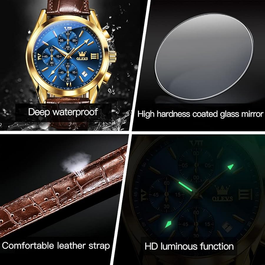OLEVS 2872 Waterproof Genuine Leather Belt Quartz Wrist watch for Men's-Golden Blue