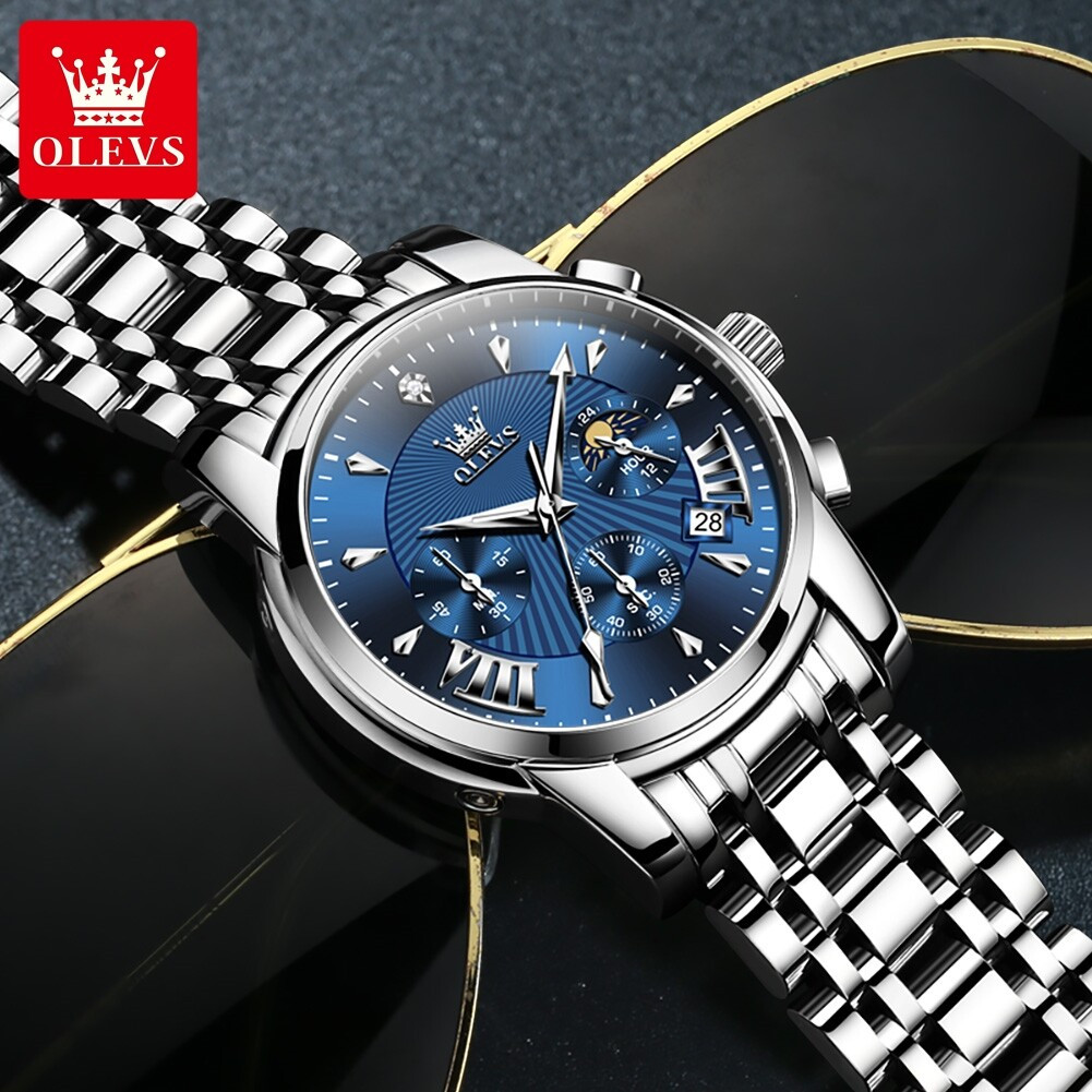 OLEVS 2892 Stainless Steel Waterproof Fashion Chronograph Silver & Blue Dial Quartz Watch For Men's