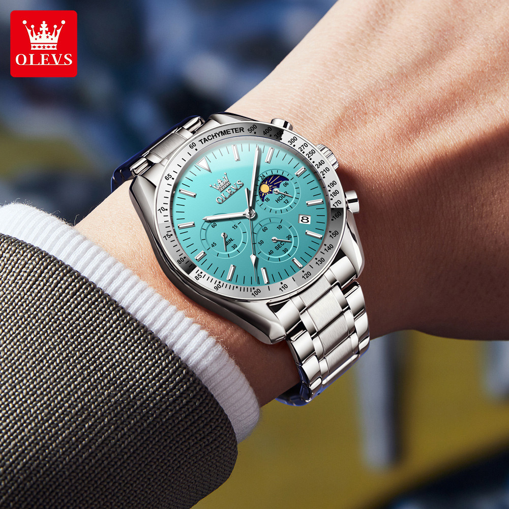 OLEVS 3618 Stainless Steel Chronograph Waterproof Wrist Watch For Men's-Silver Chain & Sky Blue