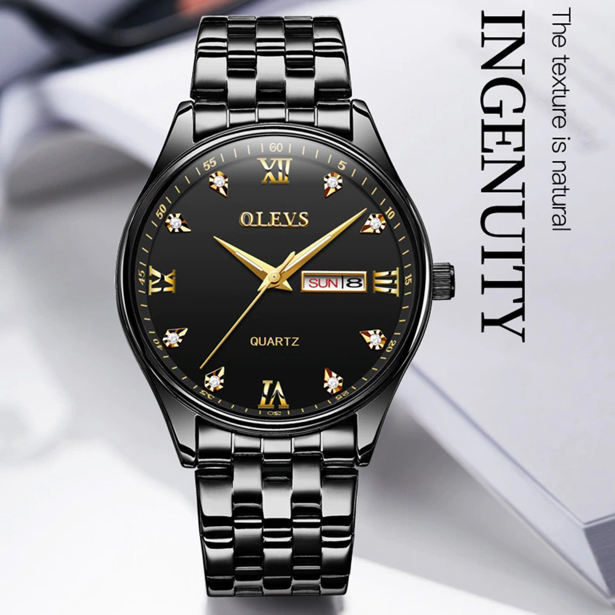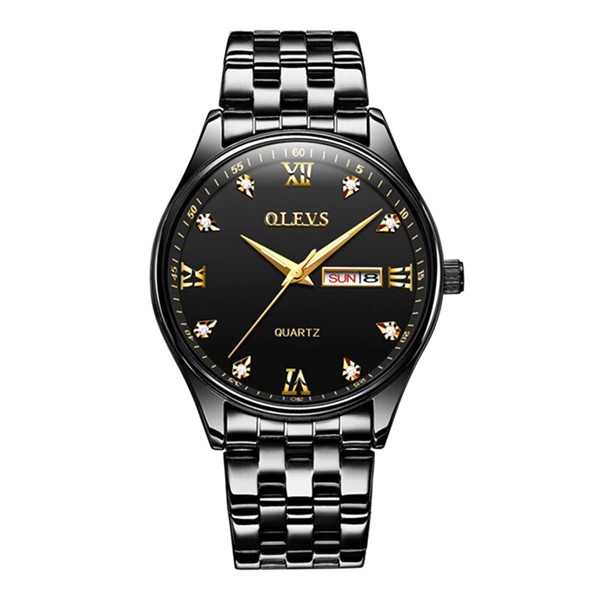 OLEVS 5570 Men's Stainless Steel Luminous Dial Date and Week Waterproof Quartz Wrist Watch- Black