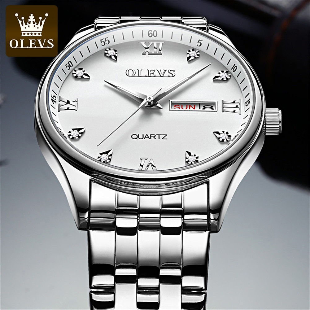 OLEVS 5570 Men's Stainless Steel Luminous Dial Date and Week Waterproof Quartz Wrist Watch- Silver