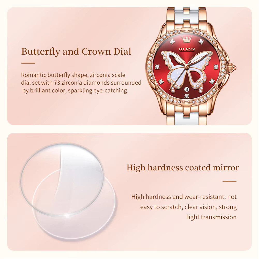 OLEVS 5610 Women's Quartz Ceramic Butterfly Diamonds Strap Waterproof Luminous Calendar Ladies Casual Wristwatch- Red Dial