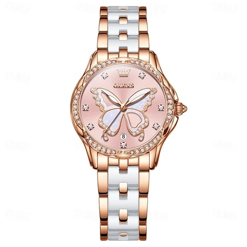 OLEVS 5610 Women's Quartz Ceramic Butterfly Diamonds Strap Waterproof Luminous Calendar Ladies Casual Wristwatch- Rose Gold