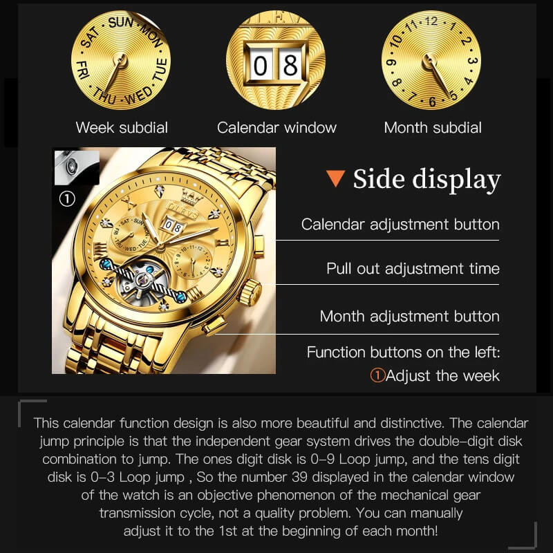 Experience timeless elegance with the OLEVS 9910 Men's Automatic Mechanical Tourbillon Self-Wind Luxury Stainless Steel Watch. Crafted with precision and sophistication, this watch features a mesmerizing tourbillon movement that showcases the intricate mechanics of timekeeping. With its self-winding mechanism, you'll never have to worry about battery changes, while its waterproof design ensures durability and reliability in any setting. Made from high-quality stainless steel, this watch exudes luxury and style, making it the perfect accessory for any occasion. Elevate your look with the OLEVS 9910 Men's Automatic Mechanical Tourbillon Self-Wind Luxury Stainless Steel Watch.