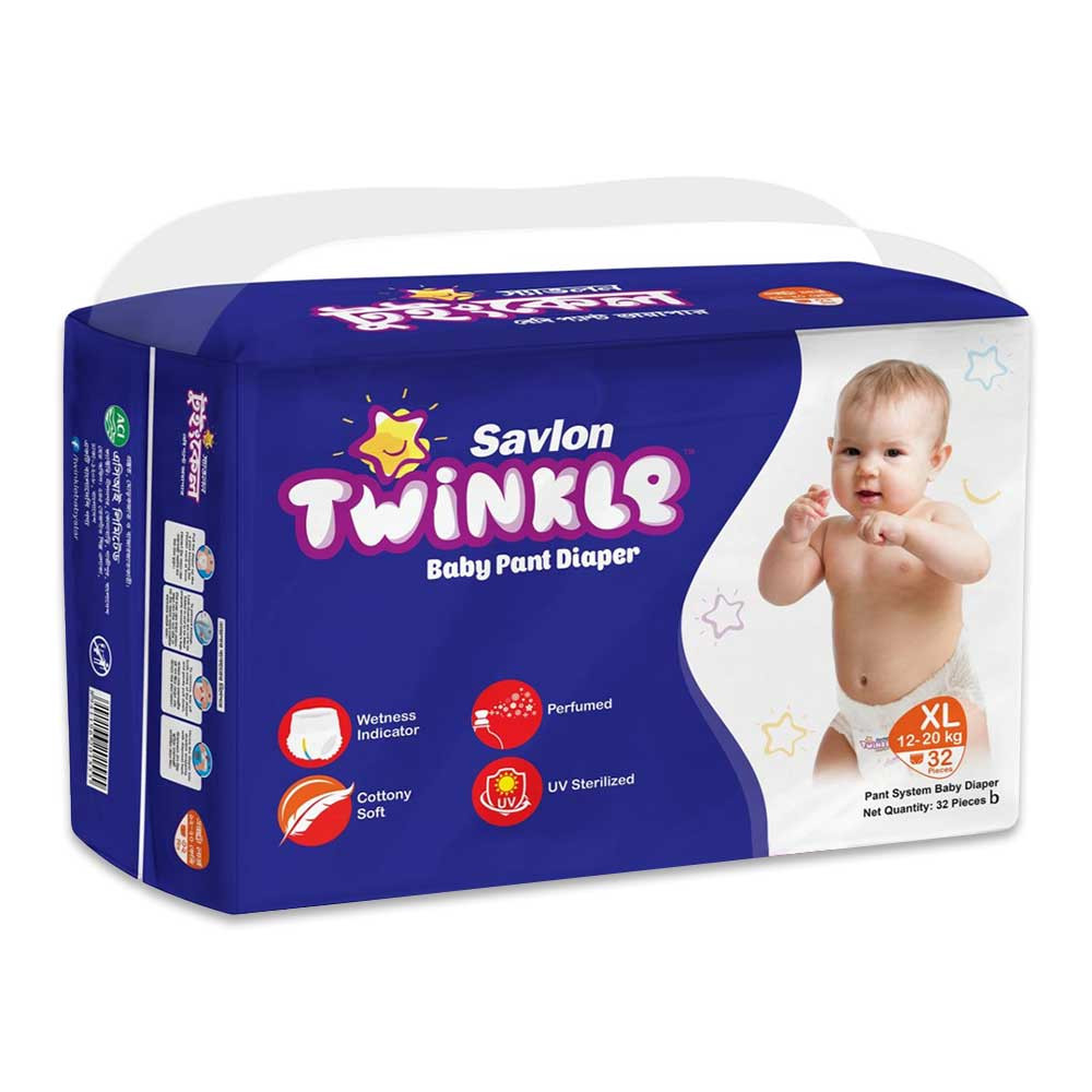 Savlon Twinkle Baby Pant Diaper XL 32 Pieces is a soft diaper. Twinkle Baby Diaper is an unfailing companion in the wonderful journey called motherhood. Completely Leak Proof.