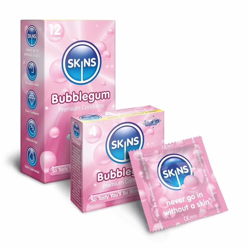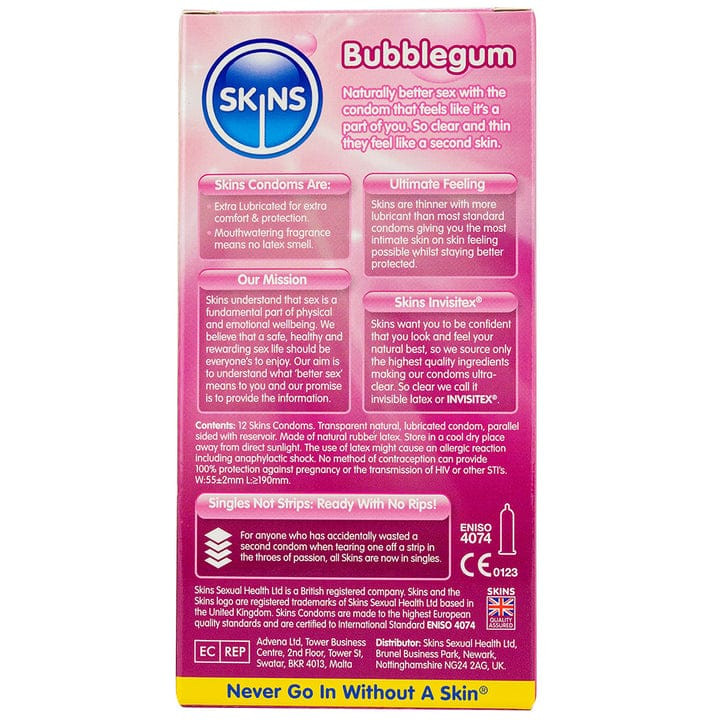 "Indulge in playful intimacy with SKINS UK Bubblegum Flavored Condoms. Designed for both protection and pleasure, these condoms offer a burst of sweet flavor to enhance your sensual experience. Crafted with premium materials and advanced technology, SKINS UK Bubblegum Condoms provide reliable protection while adding an exciting twist to your intimate moments. Explore our range of delicious flavors and elevate your sensory experience with SKINS UK Bubblegum Condoms. Because safe doesn't mean sacrificing excitement."
